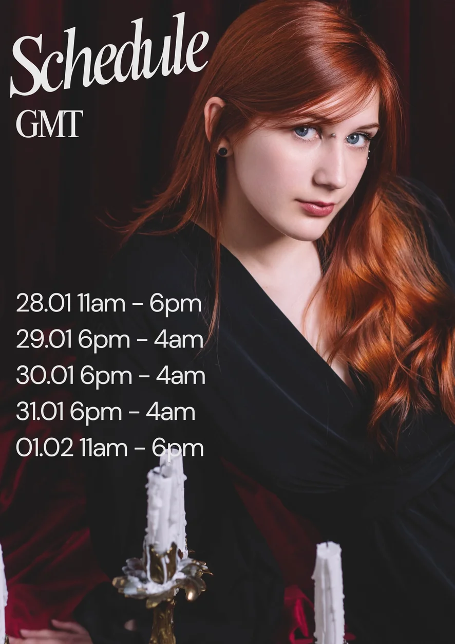 Magassarkú, Jóga, Cigizős, Nejlon, Iroda, Farok értékelés, Ahegao, Mocskos beszéd, Úrnők, Villantás, Kiverési utasítások, Szájpecek, Lovaglás, Kutyapóz, Szerepjáték, Megalázás, Lábfétis, Lábmunka, Dildó vagy vibrátor, Kézimunka, Maszturbálás, Felszarvazott, Sztriptíz, Twerk, Félmeztelen, Erotikus tánc